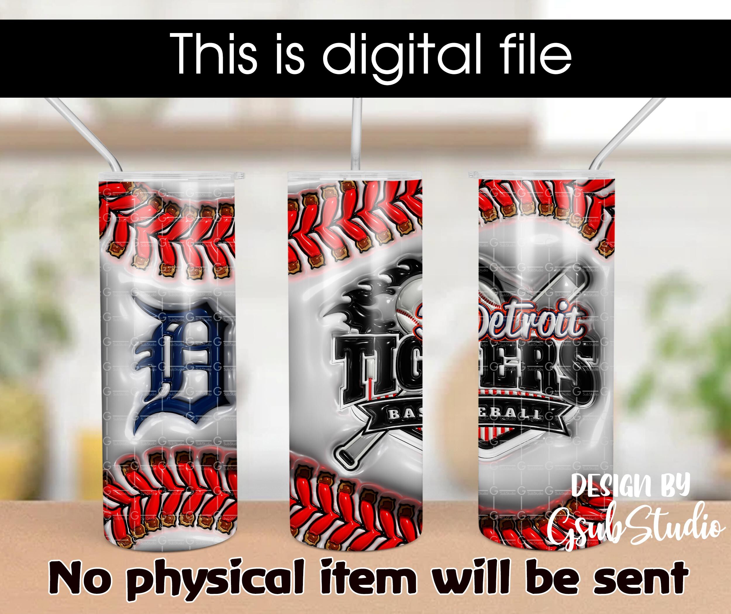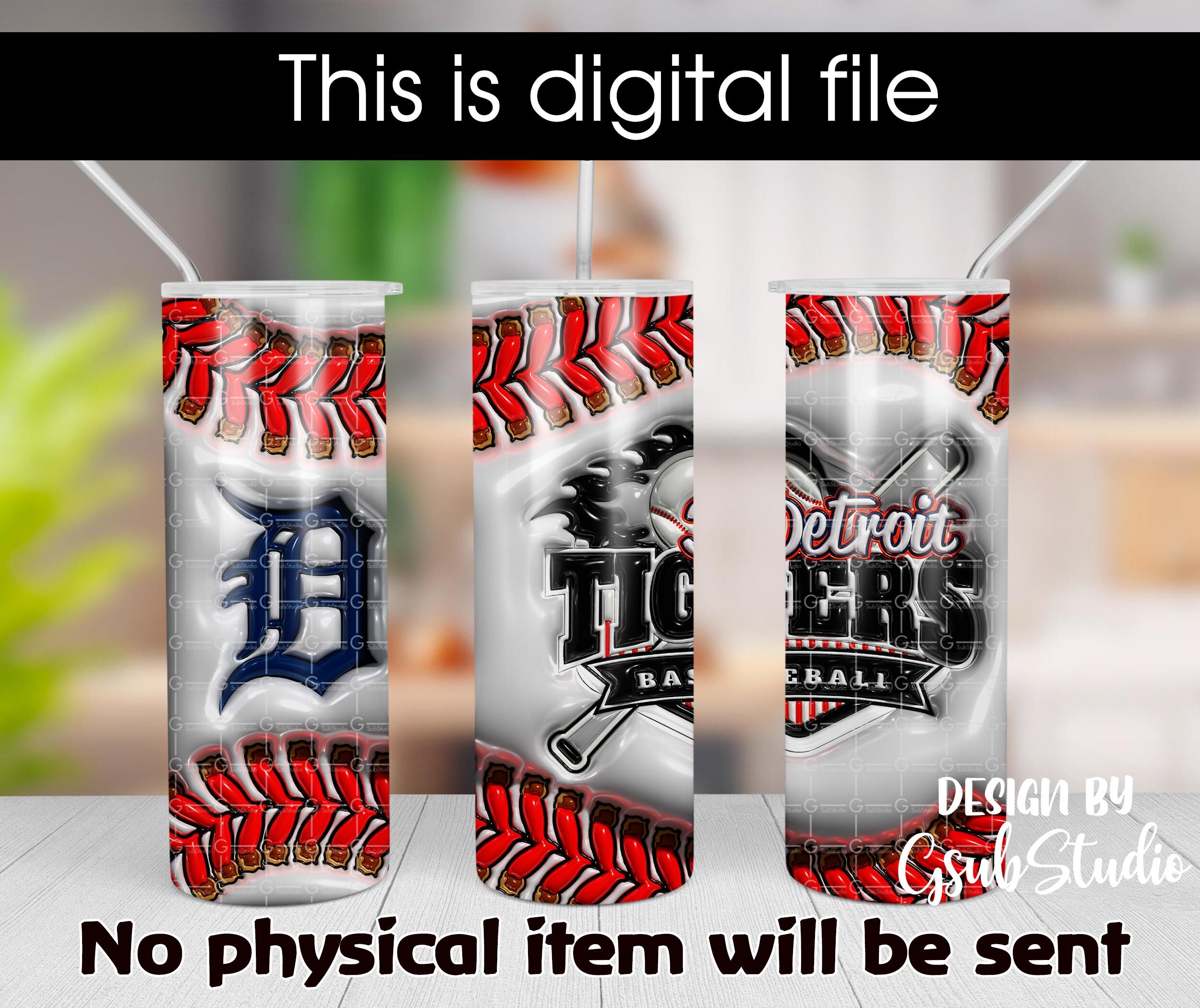 3D Inflated Detroit Tigers Baseball 20oz Tumbler Wrap PNG Sublimation 3D Puffy 20oz Skinny Tumbler Sublimation Digital Only
